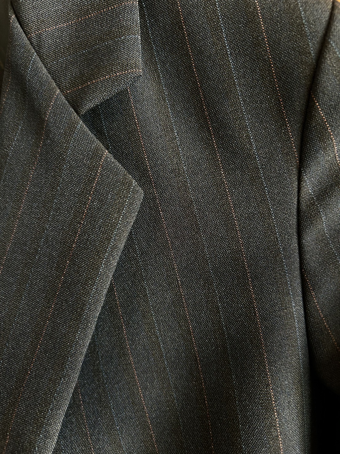 長ズボンのチャコールグレー&ネイビーのストライプのスーツになります。※シャツは別途レンタル可能です